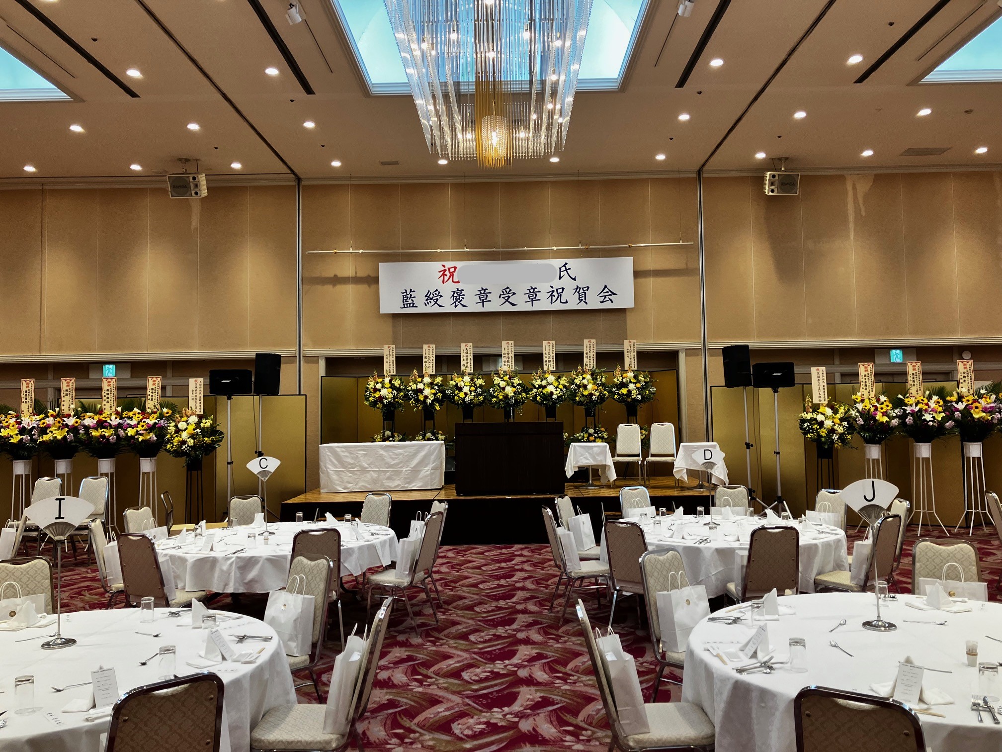この日は藍綬褒章受章された方の祝賀会司会でした!160名もの方が列席となりました。祝辞、来賓紹介と、お祝いの言葉の他、会場からロビーまで、所狭しとスタンド花が飾られていました。受章者の方は、消防団に入団後、40年以上にもわたり、地域防災の要として消防団を牽引し、防災意識の向上や地域安全・安心の確保に揺るぎない礎を築いてこられました。その功績が認められ、この度の藍綬褒章受章です!余興はノブ&フッキーさんのものまねショー。矢沢永吉さんの歌では、名前入りタオルで参加の方も!盛大に開かれた祝賀会。受章者の方は、今後もさらなる地域防災に力を注いでいきたいと話していました!この度の藍綬褒章受章、誠におめでとうございます。